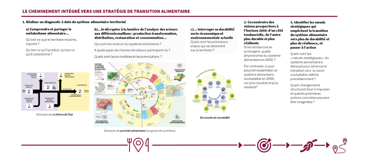 Une fois combinés, les différents éléments détaillés précédemment permettraient d’améliorer très significativement le dispositif qui a été testé dans le cadre du programme TETRAA. Ils posent les bases d’une démarche intégrée de pilotage stratégique de la transition des systèmes alimentaires territoriaux en cinq étapes, à la fois ancrées dans les réalités de terrain et axées sur le changement structurel :