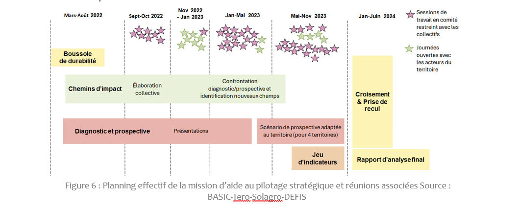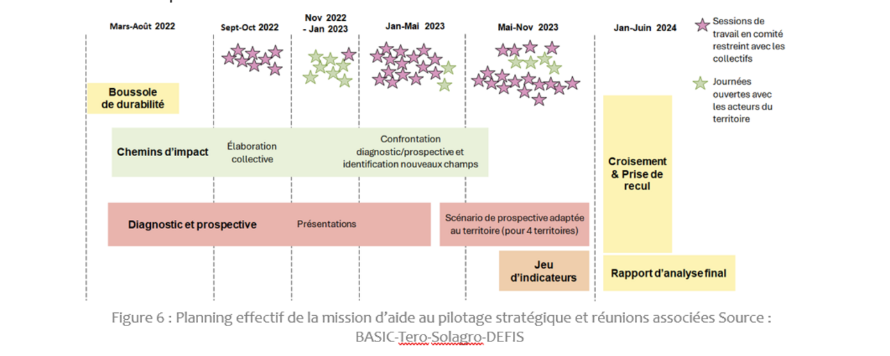 De manière opérationnelle, la mission a nécessité bien plus d’ateliers et de réunions de travail avec les différents collectifs locaux que ce qui avait été anticipé, et le calendrier a dû s’adapter aux impératifs et au rythme de travail des territoires ainsi qu’aux différences en termes d’ancienneté de la démarche, de nature et de maturité des collectifs locaux… Le résultat est illustré dans le schéma ci-après.