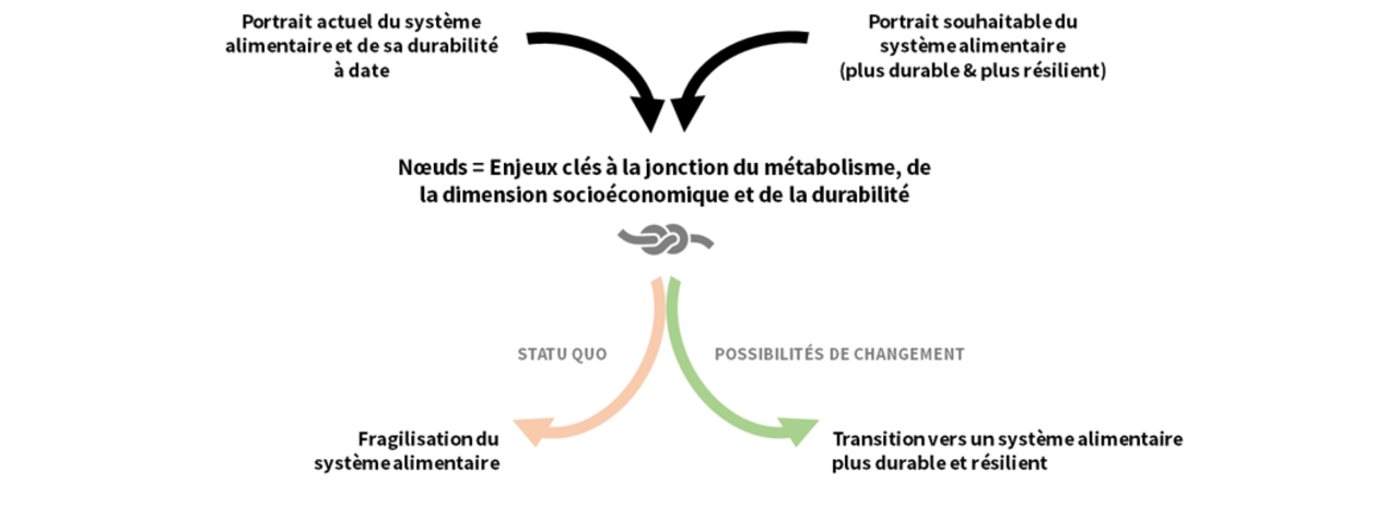 - Au centre est représenté le métabolisme alimentaire territorial, c’est-à-dire les flux de matières premières et de produits transformés qui transitent par le territoire jusqu’à leur consommation finale ; ces flux sont à la fois cause et conséquence de la présence sur le territoire des acteurs aux différents maillons (i.e. les flux sont à l’origine des typologies d’acteurs qui s’installent et se développent ou déclinent au niveau local, et en retour les acteurs influent directement sur l’évolution des flux aux différents maillons).