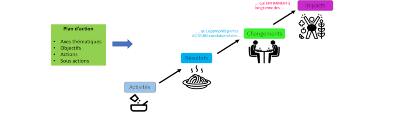Quant aux sessions de travail portant sur les chemins d’impact, elles ont tout d’abord permis aux acteurs locaux de se familiariser avec les fondamentaux du suivi-évaluation : que recouvrent ces concepts ? Comment élaborer et choisir des indicateurs ? À quoi peut servir un dispositif de suivi-évaluation ? Elles ont également permis aux territoires de se questionner collectivement sur le lien entre leurs plans d’action et les changements attendus qui sont sensés en découler : est-ce que les activités conduites vont suffire pour induire les changements souhaités ? Y a-t-il d’autres actions, acteurs qui contribuent à ces changements ? … Poser ces questions a permis aux collectifs locaux d’avoir un regard réflexif sur les actions proposées et d’appréhender la robustesse de leur logique d’intervention, et donc les chances de voir se réaliser les changements souhaités du fait de leurs actions (en amont des impacts souvent plus lointains et pour lesquels la part de responsabilité du projet est complexe à identifier). La formalisation des chemins d’impact a aussi permis aux territoires de mieux cibler leurs actions et de mieux identifier les acteurs avec lesquels travailler. Les projets portés par les collectifs locaux étant des programmes qui agrègent plusieurs axes d'intervention (parfois pensés indépendamment), l’exercice de reconstitution des chemins d’impact a clairement permis aux équipes techniques de faire du lien entre les différents axes et fiches actions qui les composent. La question du portage politique mais aussi technique par l’équipe d’animation a été un facteur déterminant de l’appropriation de la démarche par les territoires. Suite à la mission, les chemins d’impact ont été remobilisés par plusieurs collectifs locaux à fins de présentation de la politique agricole et alimentaire du territoire (Pays Cœur d’Hérault), pour argumenter des demandes de financement (Douaisis Agglo), ou encore pour continuer à construire la politique agricole et alimentaire du territoire (Pays Terres de Lorraine). Mais le contexte de mise en œuvre du programme TETRAA n’a pas permis d’aller jusqu’à l’étape de mesure des changements car la question de l’évaluation paraissait encore prématurée pour beaucoup de territoires, et les moyens humains et financiers disponibles étaient trop limités, même pour les démarches les plus anciennes et matures.