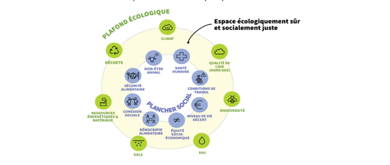 - Un cercle extérieur qui représente le plafond environnemental à ne pas dépasser pour garantir la stabilité du système Terre et donc son hospitalité pour les espèces qui y vivent. Il prend la forme de 7 capitaux principaux à préserver, entretenir et renforcer : le climat, la qualité de l’air, la biodiversité, la ressource en eau (qualité et quantité disponible), les sols (qualité et quantité disponible), la disponibilité des ressources non renouvelables et la capacité des écosystèmes à assimiler les déchets générés par le système alimentaire.
