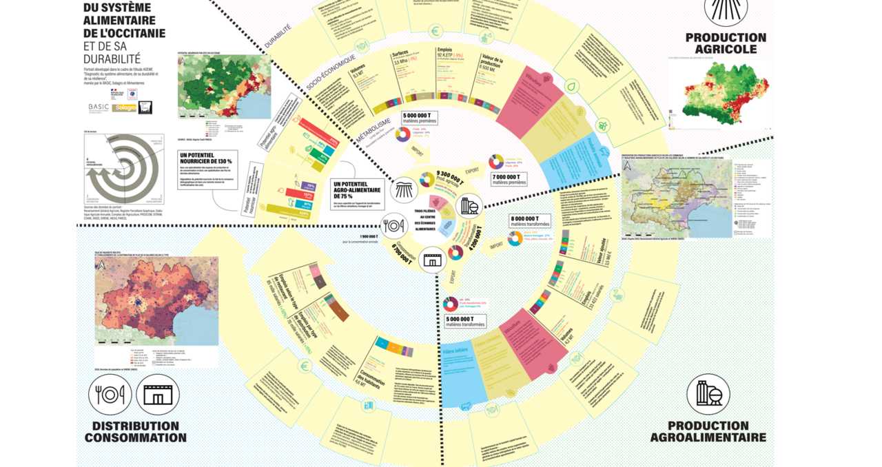 Ce concept de portrait, représentation à la fois synthétique, synoptique et systémique a été testée avec succès avec les communes membres du pôle métropolitain de Cap Azur, dont fait partie la ville de Mouans-Sartoux qui est l’un des territoires d’expérimentation du programme TETRAA. Elle a également été mise en œuvre lors de 3 autres études qui ont été menées par le BASIC en 2023 pour le compte de l’ADEME, cette fois-ci à l’échelle régionale (Occitanie, Normandie et Auvergne Rhône-Alpes). La figure ci-après illustre l’exemple du portrait alimentaire d’Occitanie. Une version numérique est gratuitement accessible au lien suivant : https://portraits.basic.coop/.