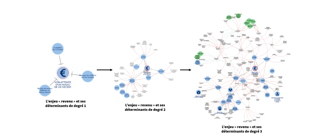 Cet outil permet de rentrer par une problématique particulière, par exemple celle du revenu des producteurs agricoles (cf. illustration ci-dessus) et d’identifier les principales composantes associées : niveau de rémunération plus faible que le niveau de vie décent, instabilité dans le temps, manque de visibilité sur son évolution. Ces causes premières (niveau 1) proviennent elles-mêmes de causes plus profondes (niveaux 2, 3, 4…) qui peuvent être représentées sous forme de chaînes de causalité qui sont aussi liées à d’autres enjeux : dégradation de la cohésion sociale, inégalités socio-économiques, mauvaises conditions de travail, problèmes de santé, pratiques qui dégradent l’environnement… Ce type de modélisation permet ainsi de prendre en compte les interdépendances entre les différents enjeux et d’identifier les dynamiques de « verrouillage » qui peuvent être à l’œuvre au sein des systèmes alimentaires.