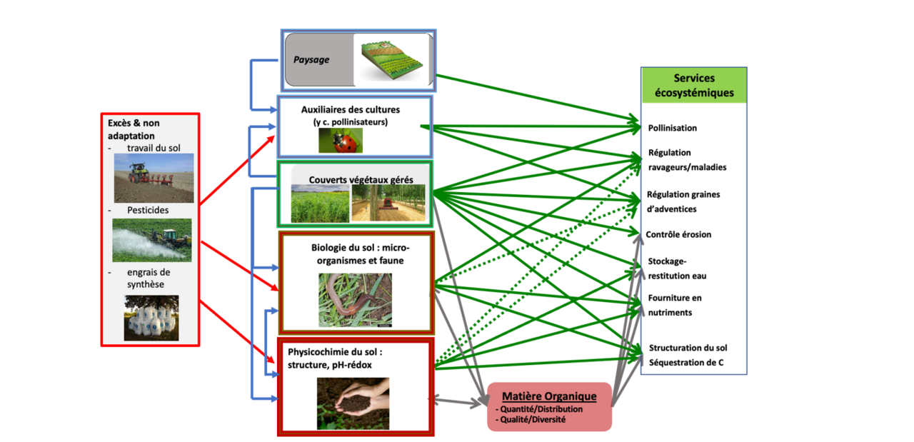 Les couverts végétaux gérés (rotation de cultures, intercultures, variétés, bandes enherbées, AF…) et les habitats semi-naturels génèrent dans les sols, les parcelles et les paysages, une biodiversité dite associée, qui arrive spontanément dans l’espace géré par l’agriculteur, mais qui est filtrée par ses pratiques (Power, 2010). Biodiversités, planifiée et associée, en interaction avec les pratiques, déterminent la dynamique de la MO du sol et des services écosystémiques à l’agriculture (ex. régulations biologiques) mais aussi à la société (ex. régulation du climat) (fig 1). A l’inverse, certaines pratiques agricoles comme les excès de travail du sol, d’utilisation des intrants de synthèse, de simplification des paysages, impactent négativement la biodiversité, surtout associée, et in fine les services qu’elle fournit à l’agriculture comme à la société (Therond et Duru, 2019).