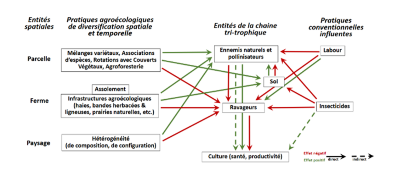 Tamburini et al. (2020) mettent aussi en évidence que les deux leviers les plus importants pour soutenir la pollinisation, sont la diversification végétale non cultivée (diversité constitutive des habitats semi-naturels ou infrastructures agroécologiques) puis l’arrêt de l’usage des pesticides. Enfin, une récente synthèse propose de classer différents leviers quant à leurs effets sur la régulation des bioagresseurs, la séquestration du carbone et les fonctions régulatrices du sol vis-à-vis de l’eau (Vialatte et al., 2023). Les auteurs ont jugé, ‘à dire d’experts’, que trois leviers agroécologiques sont d’une efficacité notable pour favoriser ces services, et sont, par ordre d’effet décroissant : l’agroforesterie, la rotation des cultures et les couverts végétaux, les cultures associées. Notons toutefois, concernant l’agroforesterie et ses effets sur le service de contrôle biologique des ravageurs des cultures, qu’une méta-analyse récente conclut sur son potentiel effectivement prometteur en régions tempérées (en régions tropicales, ses effets positifs pour ce service sont largement démontrés), mais aussi sur le caractère encore peu représentatif des 12 études seulement ayant servi de base à ce travail (Staton et al., 2019).