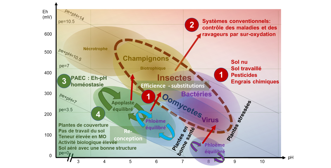 Cette approche homéostatique Eh-pH de la santé des sols et des plantes offre une perspective originale pour démêler les nombreuses interactions Génotype x Environnement x Pratiques x Ravageurs/Pathogènes et ainsi clarifier l’impact des pratiques culturales sur la santé des sols et des plantes.