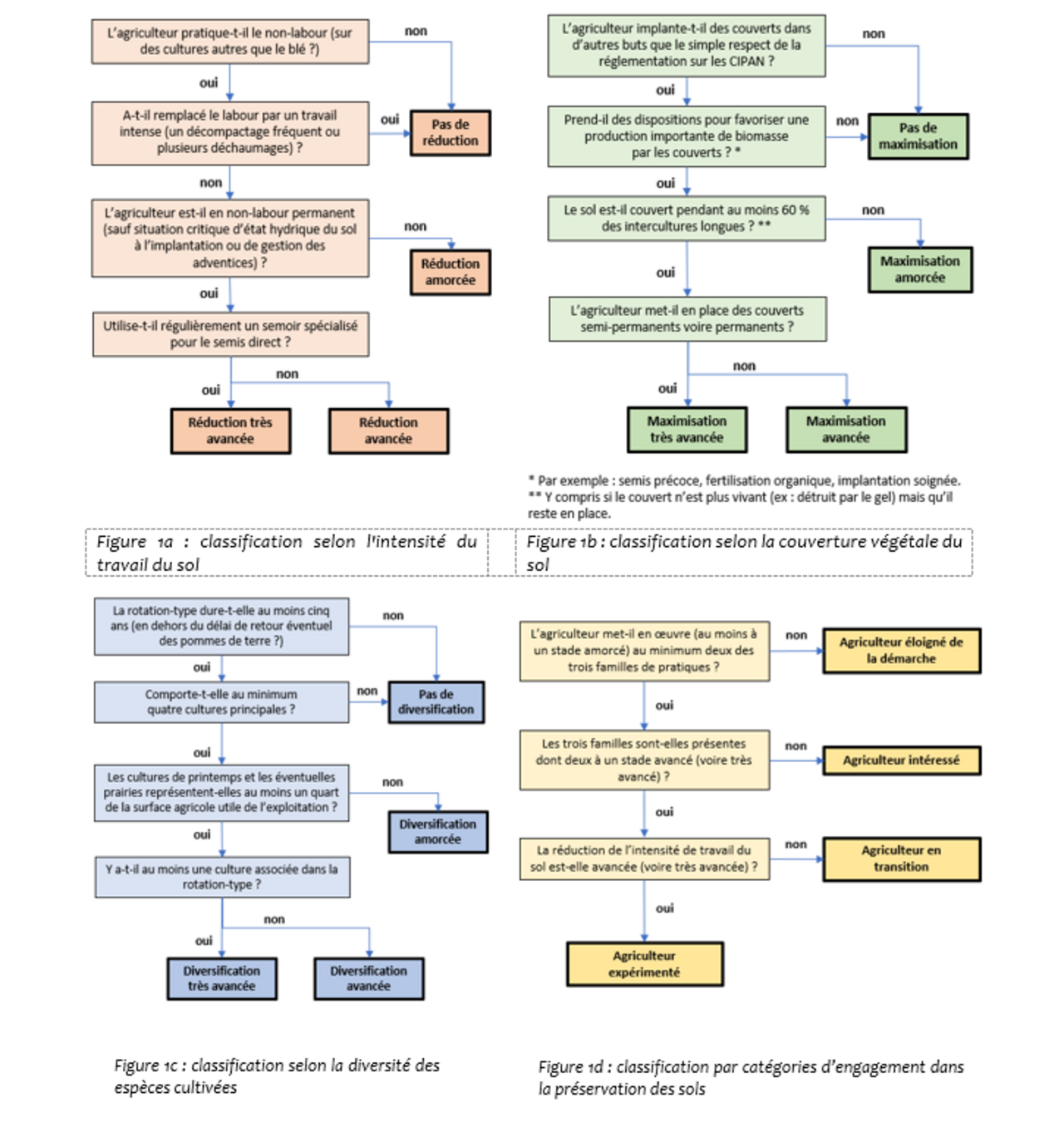 Pour choisir les agriculteurs à interroger, les enquêteurs n’ont pas recouru à un échantillonnage systématique faute d’information suffisante. Ils ont cependant présumé que les besoins formulés par les agriculteurs seraient différents en fonction des systèmes de cultures présents sur leur exploitation, de leur gradient d’engagement dans chacun des trois « piliers » de l’ACS et de la façon dont ils les combinent. C’est pourquoi ils ont cherché, au gré des contacts qu’ils ont pu obtenir par des conseillers ou des agriculteurs eux-mêmes, à prendre en compte différents systèmes et à avoir une représentation relativement équilibrée des différents stades d’avancement dans les techniques de préservation des sols. Au fur et à mesure de la progression de l’enquête, les situations enquêtées ont ainsi été classées selon les trois « piliers » par lesquels la FAO définit l’ACS et auxquels les pratiques rencontrées pouvaient être plus ou moins parfaitement rattachées : la réduction de l’intensité du travail du sol (Figure 1a), la maximisation de la couverture végétale du sol (Figure 1b) et la diversification des cultures (Figure 1c). Ces trois classifications ont été combinées pour obtenir une classification globale des situations enquêtées par catégorie d’engagement dans la préservation des sols (Figure 1d). Afin de documenter ces situations, les agriculteurs enquêtés ont notamment été interrogés sur la taille de leur exploitation, les rotations culturales et les itinéraires techniques mis en œuvre. La diversification des cultures a été évaluée à partir de la rotation-type principale de l’exploitation (au regard de la surface couverte par cette rotation), certaines exploitations présentant deux rotations-types, par exemple : une sur les limons profonds et une sur les « cranettes » (sols limoneux-sableux dont le soubassement calcaire affleure, que l’on rencontre couramment en bordure de plateau).