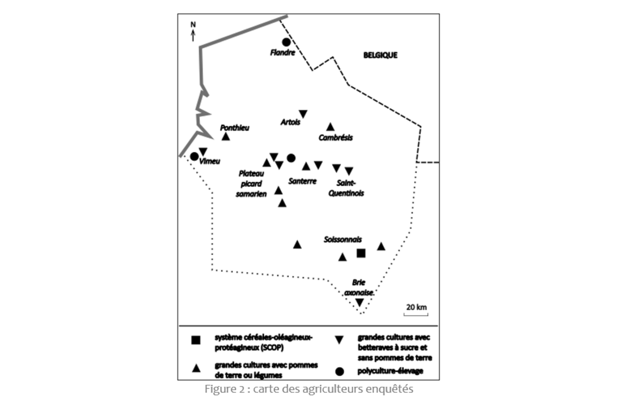 Dans le Santerre, les grandes cultures autres que les céréales et oléo-protéagineux couvrent 36 % de la SAU (Agreste, 2020 c), une proportion semblable à celle observée dans les Flandres et le polder des Wateringues. Le contexte naturel et socioéconomique est toutefois différent : la surface moyenne d’une exploitation agricole s’élève ici à 113 ha (pour la région Hauts-de-France, cette moyenne est de 91 ha. Le climat océanique est dégradé par les influences continentales : avec 670 mm de précipitations annuelles, le Santerre reçoit environ 100 mm de moins que les côtes du Pas-de-Calais mais est plus arrosé que celles-ci en été. Les sols des plateaux sont profonds et développent un important réservoir d’eau utilisable par les plantes. Ils reposent sur un socle de craie qui renferme une nappe phréatique de grande capacité, rendant possible l’irrigation (Agreste, 2023 b). Leur texture très limoneuse en surface et plus riche en argile de bonne qualité en profondeur favorise la remontée d’eau de la nappe par capillarité, ressuient plus vite et sont moins lourds à travailler que des sols argileux en surface, tout en étant plus cohérents que des sols sableux dans lesquels les tubercules sont sujets à des irrégularités de formes préjudiciables à leur rendement et à leur conservation). C’est pourquoi l’agriculture dans le Santerre accorde une large place aux cultures légumières de plein champ (petits pois, carottes, épinards…), pommes de terre et betteraves, destinées aux usines de transformation de la région. Alors que l’élevage (volailles, porcins) s’est maintenu dans les Flandres pour créer de la valeur dans les petites exploitations, la spécialisation des exploitations plus grandes du Santerre dans les grandes cultures a conduit ici à une forte contraction du cheptel de bovins, porcins et poulets.
